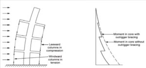 يتكون النظام من كمرات أفقية ضخمة (Outriggers)، تُنفذ غالبًا عند طابق أو طابقين محددين داخل البرج، وتمتد من النواة المركزية إلى الأعمدة الخارجية للمبنى، لتعمل كـ”دعامات أفقية” تربط القلب الهيكلي بالواجهة وتزيد من تماسكه.